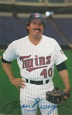 A mean-looking, husky pitcher with long hair and a mustache, Berenguer was nicknamed 'Pancho Villa' by his teammates, and Twins fans admiringly referred to him as 'Señor Smoke' or 'El Gasolino' due to his mid-90s mph fastball.[1]