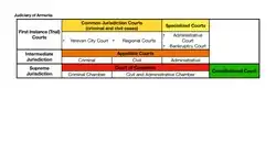 Based on article 7 of the Constitution of Armenia, judiciary in Armenia is exercised only by the courts through a three-tier judicial system, with the guarantor of its unrestricted implementation being the Supreme Judicial Council.[1]