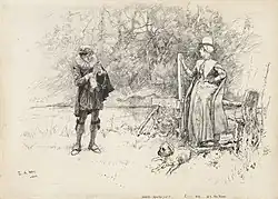 Judith unwisely allows a young man to have a preliminary look at her father's manuscript of The Tempest, a scene from William Black's Judith Shakespeare, illustrated by Edwin Austin Abbey.