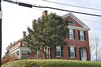 The Judson–Litchfield House is located on Southbridge's south side, on a rise on the south side of South Street. It is a 2+12-story brick structure, with a front-facing gable roof. Its front (north-facing facade) is three bays wide, with the entrance set in the right bay recessed in a segmented-arched opening, and windows set in openings with granite lintels and sills. The main gable is fully pedimented, with a louvered half-oval opening at its center. A porch added to the left of the building is a later 19th-century addition.[2]