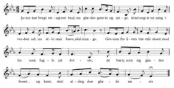 The musical setting was arranged by C.E.F. Weyse in 1841. It was his choice to reduce the number of stanza from six to three. He had also composed the tunes for Ingemann's morning songs and evening songs.[1]