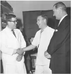Airman 1st Class Donald Farrell is greeted by Capt.  (Dr.) Julian Ward and then-Senate Majority Leader  Lyndon Baines Johnson after spending seven days in a  cramped chamber at Randolph AFB in 1958
