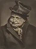 He was elected an honorary fellow of the Royal Photographic Society.[49] In his early history of the medium in Australia Jack Cato asserted that Smith "had no superior in any part of the world".[50] His portraits are in an outmoded Pictorialist style in a period of the emerging New Photography,[51][52] artistically lit with orchestrated, sometimes melodramatic, poses,[53] and printed with radical overexposure in pyrocatechin developer and bleaching-back with ferricyanide.[50] In his more contrived, but popular,[52] 'character study' tableaux the subject may be costumed as a protagonist from Dickens, Shakespeare, or from nursery rhymes.