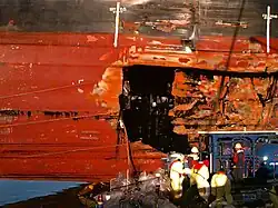 A team from Bath Iron Works conducted temporary repairs of the vessel after the incident. The ship was inspected multiple times before being allowed to travel under its own power to ASTANO in Spain for further repairs.[3]