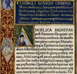 A second treatise entitled De natura angelica (also known as Opus de natura caelestium spirituum quos angelos voca, English On the Nature of Angels) was printed at Florence by Bartolomeo de' Libri in August 1499. It was based on public questioning he underwent from the learned men of Dubrovnik in May–July and was dedicated to the senate of Dubrovnik.[68] Ante Kadić considers it "[h]is most interesting work."[69] There is a possible portrait of Dragišić in the inhabited initial at the start of the codex.[44]