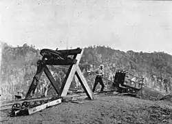 Logging played only a secondary role in the area, but mines needed kauri timber both for construction and for heating the ore ovens. Local loggers thus operated a narrow gauge logging railway including a small steam engine.[6]