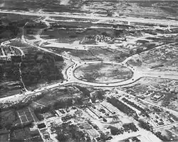 The Kadena area has some of the oldest settlement remains, in the form of shell mounds, on Okinawa Island.[5] The Hija River, the modern border between Yomitan and Kadena, was the focus of these early settlements.[5] A number of ruins of minor gusuku (castles and forts) can be found in the area.[5] Amawari, an infamous warlord, was born in the Kadena area while it was still part of Chatan.[5] Japan annexed the island in 1879, and Chatan became a village in 1908. During the Pacific War, Japan built an airstrip in the Kadena area. During the Battle of Okinawa in 1945, the United States landed on the banks of the Hija River and captured the airstrip. The airstrip became Kadena Air Force Base. On December 4, 1948, the American military government separated Kadena from Chatan and established Kadena village.[5] The United States built Kadena Circle outside the base. On January 1, 1976, four years after Okinawa reverted to Japanese control, Kadena was elevated to town status.[5]