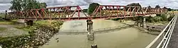 The original rail bridge was built in 1877.[10] Three spans of the bridge were washed away in June 1882.[21] The 1882 temporary bridge included 30 tons of cylinders[22] and wooden piles.[23] It was back in use in August 1882.[24] A permanent replacement was being built in October 1882[25] and completed in June 1883.[26] The railway bridge was swept away again in 1897.[27] It was converted to a road rail bridge[28] from 5 March 1900.[29] A loose beam on the bridge hit a train in 1933.[30]