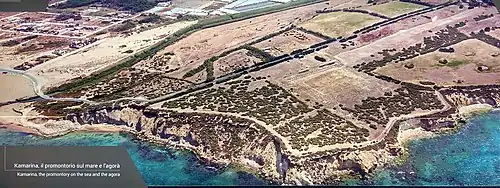 It was destroyed by Gela in 484 BC but the Geloans founded it anew in 461 BC, under the Olympic charioteer Psaumis of Camarina.[2] They appear to have done so with a democratic constitution (alongside a more general institution of democracies in the wake of the Common Resolution[3]). In 415 Thucydides describes a public meeting (syllogos)[4] at which the city decided for neutrality (though it later voted to reverse this decision[5]). A series of more than 140 lead plates, discovered around the Temple of Athena, and with information about citizens written on them, has suggested to some that Kamarina used allotment to select jurors and city officials (as Athens and other democratic city-states did). These may, however, have had some other use, for example, as a register of citizens for military purposes.[6]