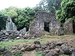 Kaniakapūpū ("the singing of the land shells"), known formerly as Luakaha ("place of relaxation"), is the ruins of the former summer palace of King Kamehameha III and Queen Kalama on the island of Oahu in Hawaii. Built in the 1840s, and situated in the cool uplands of the Nuʻuanu Valley, it served as the king and queen's summer retreat after the capital of the Kingdom of Hawaii moved from Lahaina to Honolulu in 1845. It was famous for being the site of a grand luau attended by an estimated ten thousand guests during the 1847 Hawaiian Sovereignty Restoration Day celebration.[1] The palace had fallen into ruins by 1874; no records exist about its condition in the intervening years. Rediscovered in the 1950s, the site was cleared and efforts were made to stabilize the ruins from further damage by the elements and invasive plant growth. The site remains officially off-limits to the public and trespassers are subjected to citations, although the site is not regularly monitored.