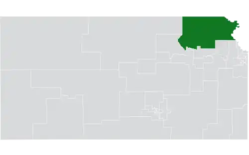 The district overlaps with Kansas's 1st and 2nd congressional districts, and with the 51st, 61st, 62nd, 63rd, and 106th districts of the Kansas House of Representatives.[4] It borders the states of Missouri and Nebraska.[1]