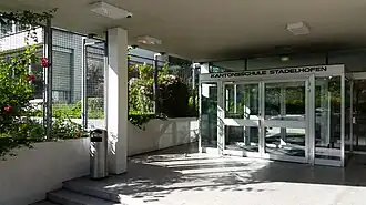 Kantonsschule Stadelhofen (KST) in Zürich-Stadelhofen is an upper secondary school in the Canton of Zürich in Switzerland. KST is organized as a public high school that is teaching on the level of the maturity profiles altsprachlich (classical languages), neusprachlich (modern languages), musisch (fine arts), and mathematisch-naturwissenschaftlich (mathematical and natural sciences). The school in its present form was established in 1975, but its predecessing institution dates back to the former Töchterschule der Stadt Zürich which was established in 1874.[2]