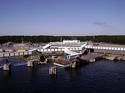 The port was served by frequent passenger ferry services to Mariehamn, Åland, Finland, operated by Viking Line, with three services per day and direction during peak season, until January 8,2023. Now there are services to Naantali in mainland Finland, calling at Långnäs port in Åland, operated by Finnlines, and to Paldiski in Estonia operated by Tallink and DFDS Seaways.