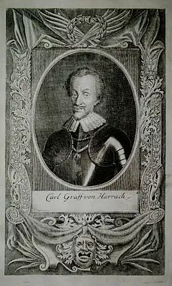 On 16 May 1628, Harrach died in Prague. His body was transported to the Harrach family mausoleum located in the Augustinian Church, Vienna.[1] [4] Harrach's passing and Eggenberg's resignation negatively influenced Wallenstein's popularity within the Imperial court, facilitating an internal purge orchestrated by the general's opponents and endorsed by the Emperor. Wallenstein and Trčka were assassinated, along with other officers, during the purge's culmination in the so-called Eger Bloodbath.[5][6]