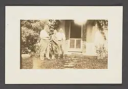 Karl and Ida von Rydingsvärd, with Wendell Volk, standing in front of the 85 Clinton St. house in Portland, ME. The house was purchased in 1925. The label on the backside of this photograph, which comes from the Douglas Volk papers, describes Rydingsvärd as a count. Note the carved panels surrounding the door.[22]