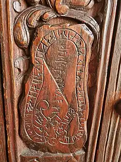 Detail view of a desk carved by Rydingsvärd (see model published in the 1909 issue of The Craftsman[54]), showing the Skåäng Runestone in Sweden. Rydingsvärd was very influenced by the folklore of his native land.