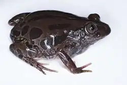 Kassina senegalensis, also known as the Senegal running frog, along with many other common names,[note 1] is a species of frog native to much of Africa. It is a small and solidly-built species with large eyes. Most of the body is greyish-black, but there are brown bands and spots on certain parts.[3] They can be found in many types of habitats, such as shrublands, grasslands, and wetlands, at elevations as high as 2,000 metres (1.2 mi).[1] Their breeding occurs in water, where eggs are laid in various locations and fertilised one by one.[4] They eat a variety of arthropods and secrete peptides from their skin to avoid becoming prey themselves.[5][6] Their population is assumed to be very large and not in any immediate danger.[1]