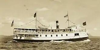 The Great Depression and the increased use of the automobile for leisure transportation led to a decline in demand, and it made the last tourist trip in 1938. In 1940 it was acquired by a paper company (later itself merged into the Scott Paper Company), and converted for use as a towboat hauling timber across the lake. This conversion included the removal of the promenade areas of the decks, and the replacement of the steam plant by a diesel engine. It continued in this use until 1976.[2]