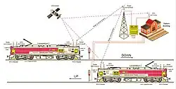 All messaging between trains and the trackside infrastructure is handled through radio communication. The radio towers used by the Kavach for communication are installed alongside the tracks, aligned with the lineside signalling equipment and railway stations, and are deployed at a regular interval of 1–5 km, depending on the overall terrain.[9][10] Kavach communicate with relevant signalling control stations, being interfaced with both Electronic interlocking (EI) and Route Relay Interlocking (RRI) systems, functioning in both absolute and automatic block signaling sections to retrieve information on signal aspects, permitted speeds, movement authority, and any restrictions; these criteria are continuously and automatically checked against each train's reported criteria and presented to the Loco Pilot on the DMI screen. The GSM-R radio link is also used to send data to the Network Monitoring System (NMS) to log all train movements, inputs, and fault messages; where appropriate fault teams are automatically contacted to address issues that arise in real time.[8]