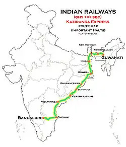 The 12509 / 12510 Kaziranga Superfast Express is a Superfast express train operated by Northeast Frontier Railway zone that runs between Guwahati and Bangalore the capital of Karnataka in India via Rampurhat , Malda Town , New Jalpaiguri. It is currently being operated with 12509/12510 train numbers on tri-weekly basis.[1][2]