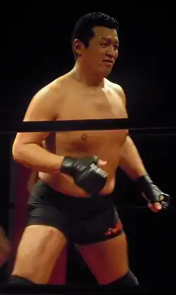 At Wrestling World 2003, Murakami and Yasuda lost to Michiyoshi Ohara and Shinsuke Nakamura.[2] The following month, Murakami teamed with Yasuda in a #1 Contenders Tournament for the IWGP Tag Team Championship, making it to the finals before losing to Mike Barton and Jim Steele.[7][8] However, an injury to Steele would give the title shot to Murakami and Yasuda who unsuccessfully challenged Cho-Ten on February 16.[7] Throughout much of 2003, Murakami and the rest of the Makai Club feuded with Michiyoshi Ohara's Crazy Dogs faction, and in March 2003, MMA fighter Enson Inoue was bought into New Japan to feud with Murakami. On May 2 at NJPW Ultimate Crush 2003, Murakami lost to Inoue in an extremely bloody match that ended in just 6 minutes.[9] In the fall of 2003, Murakami began competing in a series of three "bounty" matches, where the winner would receive a cash prize from Makai Club leader Kantaro Hoshino. He defeated Shinya Makabe at Road to Ultimate Crush on September 21 in a 1,000,000 Yen Bounty match, then fellow Makai Club member Katsuyori Shibata at Ultimate Crush II on October 13 in a 2,000,000 Yen Bounty match, and finally Koji Kanemoto at Yokohama Dead Out on November 3 in a 4,000,000 Bounty match.[10] In early 2004, Murakami began feuding with Hiroshi Tanahashi for the IWGP U-30 Openweight Championship, which eventually led to an empty arena steel cage match on March 28 at King of Sports, won by Tanahashi.[11] On May 3, 2004 at Nexxess in the Tokyo Dome, Murakami teamed with Masahiro Chono to unsuccessfully challenge Yoshihiro Takayama and Minoru Suzuki for the IWGP Tag Team Championship.[12] Makai Club broke up in the summer of 2004 and Murakami would briefly join Masahiro Chono's Black New Japan stable before leaving New Japan shortly after. His last match under contract to the promotion took place on July 7, where he, Katsuyori Shibata, Super Strong Machine, Mitsuya Nagai and Masahiro Chono defeated Hiroyoshi Tenzan, Osamu Nishimura, Shinya Makabe, Yuji Nagata and Yutaka Yoshie.[13] Murakami would return to New Japan for a one off match at the 2006 Tokyo Dome show, losing to Yuji Nagata.[14]