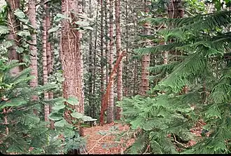 Keaīwa Heiau State Recreation Area is the ruins of a temple (Heiau in the Hawaiian language) at the summit of a hill and neighborhood called ʻAiea Heights on Oʻahu, Hawaiʻi. The recreation area includes camping facilities and a 4.8-mile (7.7 km) trail. It also offers clear views of Pearl Harbor.[1] The high point of Puu Uau is about halfway down the trail, where native ohia lehua and koa trees may be viewed.[2] The remains of a military plane that crashed in 1944 can also be seen along the trail. The hike is not particularly difficult, however it does include one quite steep switchback stretch and can be extremely muddy if it has just rained. Allow for around 2.5 hours of easy strolling. A possible translation of Keaʻiwa would be mysterious, incomprehensible. It is believed that this name was given in reference to the healing powers of the plants that no one could really explain.[1] In addition, Keaiwa Heiau may have also been known as a "Heiau Hoʻola," or the healing or life-giving heiau according to native Hawaiian scholar Mary Kawena Pukui.[3]