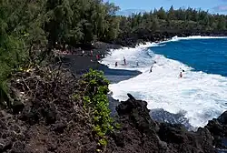 The beach was formed in a 1955 lava flow.[2] There is a point of rocks on one end of the beach that marks where the flow ended.