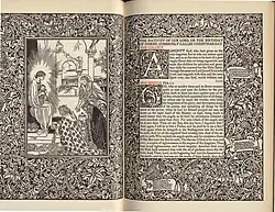 Some of the Kelmscott books are heavily decorated, with motifs similar to Morris's other designs for upholstery and wallpaper. In 1913, Holbrook Jackson wrote: "The Kelmscott books look not only as if letter and decoration had grown one out of the other; they look as if they could go on growing."[43] The title pages of Kelmscott books were usually decorated in a Victorian style.[31] Morris initially designed woodblock initials that were too dark or too large for the pages they appeared on, but later became more proficient in proofing his capitals.[44] The Kelmscott books varied greatly in ornaments; while The History of Godefrey of Boloyne is "over-decorated",[45] the first few books published by Kelmscott were sparsely decorated. Morris's border and capital designs were very similar to his wallpaper designs, and were not illustrative of the texts they adorned. While medieval texts had delicate illuminations covering their margins, the wood engravings Morris made in imitation of them were very heavy, and created production problems in the Chaucer, requiring the hand press to be reinforced with steel because of the weight of the large ornaments. [46] At times Morris preferred that his wood engravers replicated his designs exactly, even though this was at odds with John Ruskin's theory that craftsmen should have influence in the final aesthetic product they help produce.[47] Kelmscott books did not have printing on the reverse side of woodblock pages until the Chaucer, but this separation of text from illustration was precisely what Morris wanted to avoid in his book designs.[48]