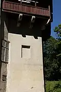 The castle has a square-shaped plan, courtyard and corner towers, two larger and two smaller. Several windows have frames in Renaissance style. Built above the entrance is a picturesque stone balcony on consoles. The consoles can be seen at the floors of the towers. The entrance is on the north side, on a bridge over the outside ditch of the castle. Old documents show that the former citadel (13th century) was protected by moats, walls and towers positioned below the plateau on which the castle was built. These were destroyed during post-war reconstruction work.