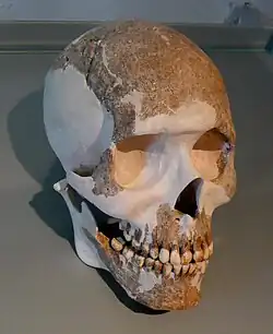 The man's clothing and grave goods are culturally inconsistent and point to both Germanic and Roman customs. On the left side of the dead man lay a three-inch long, wide iron sword, which was sheathed and encircled by his left arm. In the area of the sword hilt a sword pearl was found, which was cut in the shape of a disk from the rose of a deer antler.[3][4] The sword came from a Roman workshop.[5]