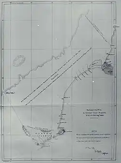 Eyre briefed Tacy Kemp, who at the time was Assistant Protector of Aborigines, with executing the land purchase. Kemp was the New Zealand-born son of the missionaries Charlotte and James Kemp. Tacy Kemp was accompanied by the surveyor Charles Kettle, whose role it was to define the Māori reserves. Kemp and Kettle sailed to Akaroa Harbour where they called a meeting of Māori chiefs. After just three days of negotiations at Akaroa, 16[4] or 40[5] chiefs (sources differ) signed what became known as Kemp's Deed on 12 June 1848.[6] The land purchase extended from the Ashley River in the north to the previously purchased Otago Block in the south at the Waitaki River, and from the east coast to the west coast. Banks Peninsula was excluded from the purchase due to the earlier purchase by the Nanto-Bordelaise Company.[5]