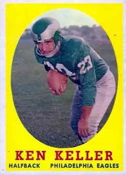 Keller was drafted in the 11th round of the 1956 NFL draft by the Philadelphia Eagles.[6] Keller served as the Eagles' starting running back as a rookie and led the team with 433 rushing yards and four rushing touchdowns. He tore ligaments in his knee in the second-to-last game of the season against the Washington Redskins.[7] Keller rushed for 195 yards on 43 carries in a reduced role in 1957.[6]
