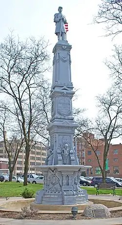 The Kent County Civil War Monument is a thirty-four foot high monumental fountain, standing in the center of a sixteen-foot diameter basin. The monument itself has a seven-foot high base, three square upper sections above, with a Union soldier at parade rest at the top. The monument contains substantial detail, including eagles, flags, and military devices and equipment, as well as the names and dates of various Civil War battles. Detail also include portraits of Abraham Lincoln, Ulysses S. Grant, James Garfield, and Admiral David Farragut; a bas relief panel entitled "Woman's Mission of Mercy," showing a woman helping a wounded soldier; quotations from Lincoln, Grant, Garfield, and Andrew Jackson; and plaques with the Michigan state seal and Grand Army of the Republic insignia.[3] As was typical of many such monuments, the memorial was cast in zinc.[4] The monument was repainted blue in 1959.[5] Fundraising for the restoration of the monument began in 2000. The required $250,000 was raised over the next three years by various organizations and community members.[6] It was officially rededicated on October 3, 2003. Monument Park was renovated from 2013 to 2014, which led to the Civil War monument being moved slightly, and a ribbon cutting ceremony took place on October 23, 2014 to commemorate the newly revamped area.