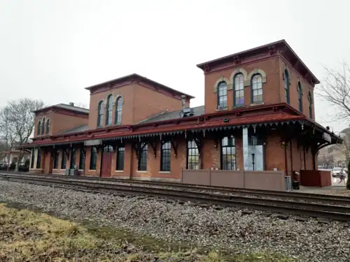At that point the depot was abandoned and boarded up. Its potential demolition in the early 1970s was one of the first major projects of the Kent Historical Society, formed in 1971,[12] which purchased the building in 1975 and renovated it, occupying the second floor along with the Kent Chamber of Commerce[5] until 2006.[13] Just prior to purchasing the building, the Kent Industrial District historic district was formed which included the depot, and it was listed on the National Register of Historic Places on December 30, 1974.[14] In 1981, the Pufferbelly Restaurant moved into the lower floor of the old depot, and operated until December 31, 2016.[15][5] After a renovation and restoration of the building for much of 2017, an Italian restaurant Treno opened in September 2017,[16] but closed in 2020 during the Covid pandemic. Since late December 2021, the depot's main level restaurant space has been occupied by the cafe Over Easy at the Depot.[17]