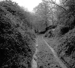 Kenwith Castle Halt had no platform or shelter and was sited at an ungated level crossing on the road to the castle; the gates had been removed in 1905.[8] The line ran through a cutting at this point. No sidings or freight facilities were provided.[9][10]
