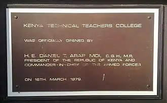 A plaque marking the college unveiling on Friday 16 March 1979 by the then President of the Republic of Kenya Daniel Toroitich Arap Moi