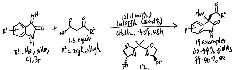Isatin-derived ketimine commonly undergoes catalytic asymmetric Mannich reaction to generate 3-substituted-3-aminooxindoles. The structure could be found in various natural or biological molecules, and such reaction could lead to enantio-enriched products. Moreover, the isatin-derived ketimines are comparatively reactive as an electrophile and thus was commonly used in various methods or reactions.