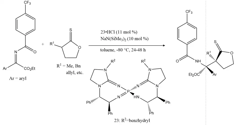 In 2016, a novel direct asymmetric Mannich reaction of ketiminoesters with thionolactones were proposed by Terada et al. by using bis(guanidino)iminophosphorane as a chiral organosuperbase catalyst. (scheme 21)[16] Comparing to thionolactones as an appropriate nucleophile, lactone is not acidic enough to be enolized by base catalyst, which makes lactone unable to act as a nucleophile. For electrophiles, having proper substituents on benzoyl protecting group can improve yields and diastereoselectivity. For instance, comparing to trifluoromethyl group on ketiminoester, methoxy substituents gives much lower yield and selectivity.
