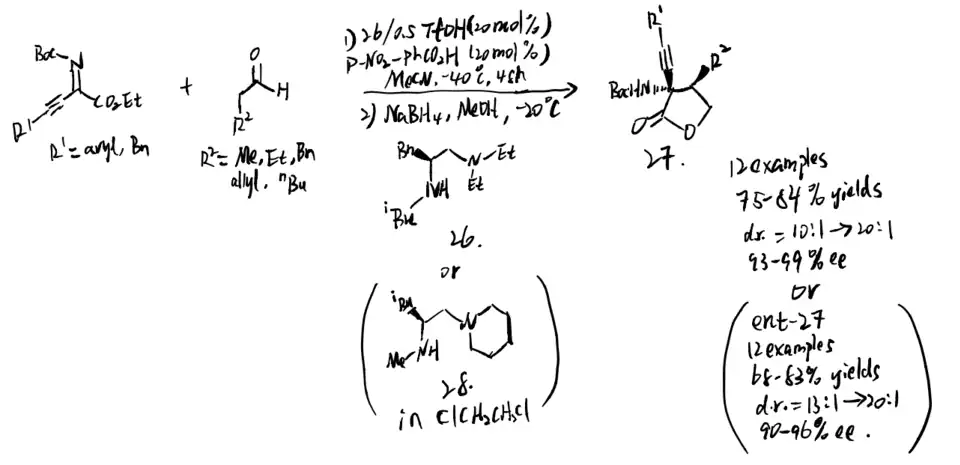 Chiral amines like amino acid derivatives can catalyze many enantioselective transformations, although enantiomers of amino acids are hard to access sometimes. In 2019, Lan et al. proposed a strategy to apply their chiral amine catalyst with minimal modification to the Mannich reaction of alkynyl ketiminoesters. (scheme 25)[20] Their application shows that catalyst 26 and MeCN can be replaced by 28 and dichloroethane for many alkynyl trifluoromethyl-, pyrazolinone-derived-, and isatin-derived ketimines to give the same stereoselectivities and yields.
