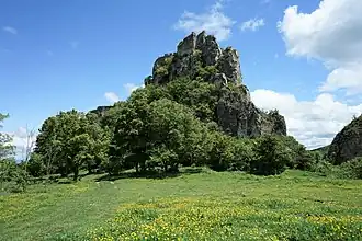 Remnants of Khornabuji castle on a cliff above the meadow.