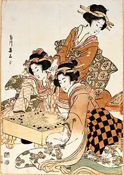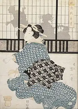 Kikukawa Eizan (菊川 英山; 1787 – July 17, 1867) was a designer of ukiyo-e style Japanese woodblock prints. He first studied with his father, Eiji, a minor painter of the Kanō school, and subsequently with Suzuki Nanrei (1775–1844), of the Shijō school. He is believed to have also studied with ukiyo-e artist Totoya Hokkei (1790–1850). He produced numerous woodblock prints of beautiful women (bijin-ga) in the 1830s, but then abandoned printmaking in favor of painting.