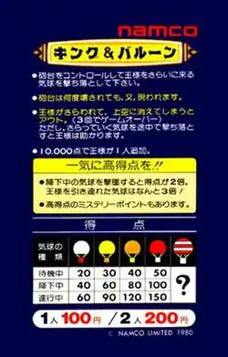 King & Balloon[a] is a fixed shooter arcade video game released by Namco in 1980 and licensed to Game Plan for U.S. manufacture and distribution.[3] It runs upon the Namco Galaxian hardware, based on the Z80 microprocessor, with an extra Zilog Z80 microprocessor to drive a DAC for speech; it was one of the first games to have speech synthesis. An MSX port was released in Japan in 1984.