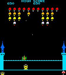 The King speaks when he is captured ("HELP!"), when he is rescued ("THANK YOU"), and when he is carried away ("BYE BYE!").[4] The balloons make the same droning sound as the aliens from Galaxian, released in the previous year, and the cannon's shots also make the same sound as those of the player's ship (the "Galaxip") from the same game.