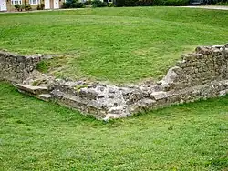 The walls are constructed of ashlar blocks to plinth level with a coursed rubble superstructure and vary between 0.8 and 1.2 m in thickness. Part of the north, east and west walls survive as exposed upstanding remains, but the rest of the structure has been reburied following the excavations in the 1980s. The north wall survives to 3.9 m high and the east wall to 3.8 m.[6]