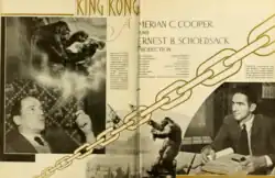 Since 1929 Cooper had wanted to create a film about gorillas.[15] Inspired by the travels of his friend W. Douglas Burden, Cooper considered filming in the jungles of Komodo.[16] He had read Burden's The Dragon Lizards of Komodo and as a result conceived the idea to film a gorilla fighting giant lizards.[17] Cooper later remarked that this was "the most important influence" on the final film.[18] By the time he joined RKO in 1931, Cooper decided to incorporate a "beauty and the beast" theme into the plot.[19] The "Arabian proverb" at the beginning of the film was created by Cooper: "And lo! The Beast looked upon the face of Beauty, and it stayed its hand from killing. And from that day, it was as one dead."[20] Initially Cooper planned to film in Africa and Komodo Island, but the idea was abandoned when RKO executives decided it would be too expensive.[21] RKO was at risk for bankruptcy because of the Great Depression.[22] Stop-motion animator Willis O'Brien, hearing that Cooper wanted to make a gorilla film, painted a picture depicting a large gorilla carrying a woman and gave it to Cooper. Afterward Cooper requested a test reel, which was approved by Selznick.[23] O'Brien experimented with different scenes in the test reel.[24] These two scenes, which were incorporated into the final film,[25] portray a fight between King Kong and a Tyrannosaurus Rex as well as Kong shaking men off a log.[26] The test reel was created concurrently with the production of The Most Dangerous Game.[27] Meanwhile, Cooper hired actors and had sets built for King Kong.[28] For live-action sequences in the jungle, Cooper utilized the set of The Most Dangerous Game.[27] Cooper directed the live-action sequences until Schoedsack completed work on The Most Dangerous Game.[29] Afterward Shoedsack directed the live action scenes while Cooper focused on the live action scenes that were to be combined with the already-filmed animated sequences.[30] Marcel Delgado developed sample models of King Kong, the dinosaurs, and the people; the models did not have armatures.[31] After about three months the test reel was complete.[32] After studio executives approved the film for production, Cooper developed the story further.[33] O'Brien's ideas also helped with story development. He suggested that King Kong be seen by the characters as a sort of deity.[18]