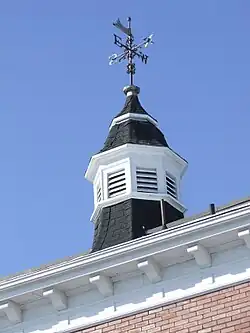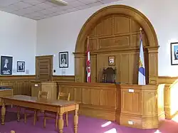 The courthouse was built in 1903, replacing a wooden courthouse from 1850 located just to the north which was so decrepit it was subsequently used as a shed to store apples. The new courthouse was built by Wolfville builder and architect Leslie R. Fairn. It combined courts, county municipal offices and land registry as well as providing offices for probate, prothonotary, treasurer, county clerk and sheriff. Fireproof safety vaults were built into the walls and were said to be "the best in the province". The courthouse was built at a cost of $20,000 from brick and decorative pressed brick made in Avonport, Kings County, and sandstone quarried at nearby Cumberland County.[1] The courthouse opened officially with the first meeting of Kings County Council in the new building on January 12, 1904.[2] The first major trial at the courthouse was in June 1904 when it hosted the trial of William Robinson for the axe murder of his wife. Found guilty in a dramatic trial, during which lightning struck the courthouse's brand-new ornate cupola, Robinson was hanged on September 12, 1904, in front of a rowdy crowd at the jail beside the courthouse, the last hanging in Kings County.[3] Trials were held in the building until 1980, when a new 2.5 million dollar municipal complex containing courts, county offices and a jail was constructed in Kentville.[4]