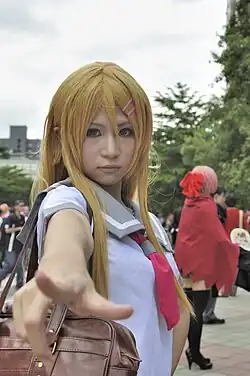 In the light novel series Oreimo, Kirino is the 14-year-old younger sister of the protagonist Kyousuke. She is normally mature and independent for her age. However, this is a facade and she only reveals her true personality—immature, abusive, and ungrateful with an aggressive, tsundere-like character—to Kyousuke,[6] whom she orders to play her games and care for the characters, only to accuse him of being a pervert and a lolicon.[7][8] She is secretly an otaku with an obsession for "little sister"-themed eroge, as well as the children's anime series Stardust Witch Meruru. She works as a magazine model and later becomes a novelist, the funds from which she uses to support her hobby. Despite her interests, she states she does not know why she started liking eroge and denies having a brother complex. Nevertheless, she frequently forces Kyousuke to spend time with her, whether it is playing games or taking her out, but denies that she actually enjoys the time they spend together.
