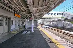 The station consists of one elevated side platform and one elevated island platform serving three tracks, with the station building located underneath[1]