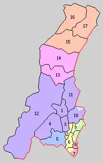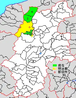 * yellow - areas formerly within the district borders during the early Meiji period