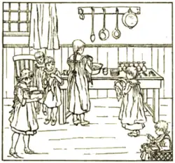 Observing the neglected condition of the many children, and the absence of any possible opportunity for their domestic training, the idea suggested adopting the kindergarten methods, which had proved so successful in the training of very young children, to convey practical instruction in all domestic duties. Developing this idea into a complete system of progressive training lessons, using songs and employments in the use of all kinds of small copies of the implements and utensils used in housekeeping, Huntington began her classes in 1877. Six lesson courses of "Occupations", comprising the several kinds of work essential to good housekeeping, were arranged, each course requiring a month's instruction. To these programs, the name "Kitchen Garden" was given as like to, yet distinctive from, "Kindergarten".[2]